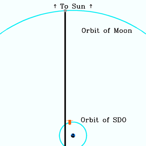 SDO excede a Lua, movendo-se cerca de 3 quilômetros por segundo perpendicular à linha Sol-Terra em comparação com 0,9 quilômetros por segundo da lua, fazendo a lua parecem se mover na direção oposta que veria se estivesse parou na Terra.